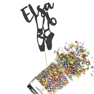Cakeshop Cake Decoration Pack Ballet Ballerina Theme Premium Double Sided Glitter Card Topper Sign & 25g Party of Sugar Sprinkles Custom Name Decorations (Black)