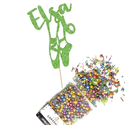 Cakeshop Cake Decoration Pack Ballet Ballerina Theme Premium Double Sided Glitter Card Topper Sign & 25g Party of Sugar Sprinkles Custom Name Decorations (Green)