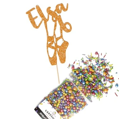 Cakeshop Cake Decoration Pack Ballet Ballerina Theme Premium Double Sided Glitter Card Topper Sign & 25g Party of Sugar Sprinkles Custom Name Decorations (Orange)