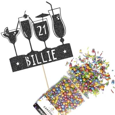 Cakeshop Cake Decoration Pack Birthday Cocktails Premium Double Sided Glitter Card Topper Sign & 25g Party of Sugar Sprinkles Custom Name Age (Black)
