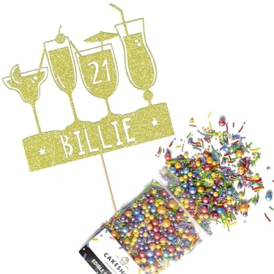 Cakeshop Cake Decoration Pack Birthday Cocktails Premium Double Sided Glitter Card Topper Sign & 25g Party of Sugar Sprinkles Custom Name Age (Champagne)