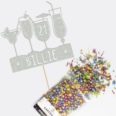 Cakeshop Cake Decoration Pack Birthday Cocktails Premium Double Sided Glitter Card Topper Sign & 25g Party of Sugar Sprinkles Custom Name Age (Light Silver)