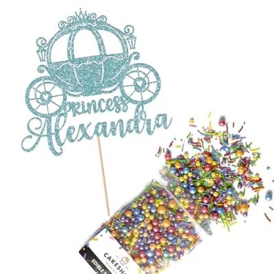 Cakeshop Cake Decoration Pack Birthday Princess Carriage Premium Double Sided Glitter Card Topper & 25g Party of Sugar Sprinkles Custom Name Decorations (Baby Blue)