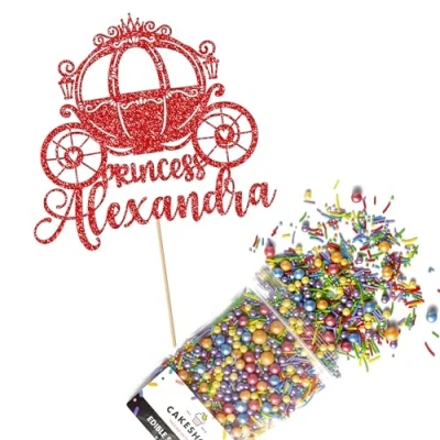 Cakeshop Cake Decoration Pack Birthday Princess Carriage Premium Double Sided Glitter Card Topper & 25g Party of Sugar Sprinkles Custom Name Decorations (Red)