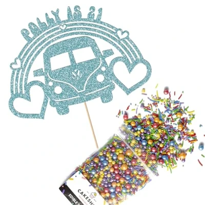 Cakeshop Cake Decoration Pack Campervan 60s Theme Premium Double Sided Glitter Card Topper & 25g Party of Sugar Sprinkles Custom Name Age Decorations (Baby Blue)