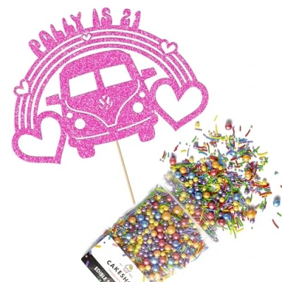 Cakeshop Cake Decoration Pack Campervan 60s Theme Premium Double Sided Glitter Card Topper & 25g Party of Sugar Sprinkles Custom Name Age Decorations (Baby Pink)