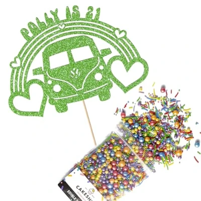 Cakeshop Cake Decoration Pack Campervan 60s Theme Premium Double Sided Glitter Card Topper & 25g Party of Sugar Sprinkles Custom Name Age Decorations (Green)