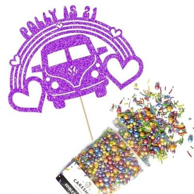 Cakeshop Cake Decoration Pack Campervan 60s Theme Premium Double Sided Glitter Card Topper & 25g Party of Sugar Sprinkles Custom Name Age Decorations (Purple)