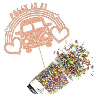 Cakeshop Cake Decoration Pack Campervan 60s Theme Premium Double Sided Glitter Card Topper & 25g Party of Sugar Sprinkles Custom Name Age Decorations (Rose Gold)