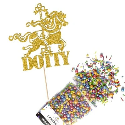 Cakeshop Cake Decoration Pack Carousel Horse Premium Double Sided Glitter Card Topper Sign & 25g Party of Sugar Sprinkles Custom Name Age Decorations (Gold)