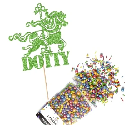 Cakeshop Cake Decoration Pack Carousel Horse Premium Double Sided Glitter Card Topper Sign & 25g Party of Sugar Sprinkles Custom Name Age Decorations (Green)