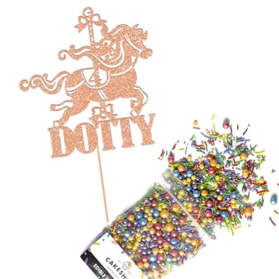 Cakeshop Cake Decoration Pack Carousel Horse Premium Double Sided Glitter Card Topper Sign & 25g Party of Sugar Sprinkles Custom Name Age Decorations (Rose Gold)