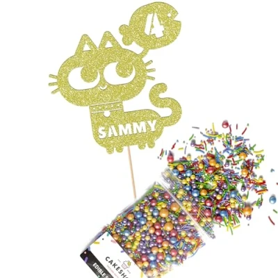 Cakeshop Cake Decoration Pack Cat Theme Birthday Premium Double Sided Glitter Card Topper Sign & 25g Party of Sugar Sprinkles Custom Name Age (Champagne)