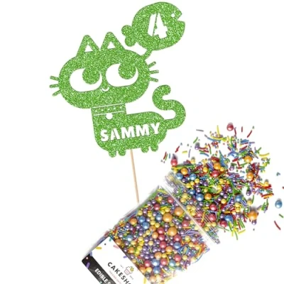 Cakeshop Cake Decoration Pack Cat Theme Birthday Premium Double Sided Glitter Card Topper Sign & 25g Party of Sugar Sprinkles Custom Name Age (Green)