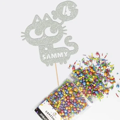 Cakeshop Cake Decoration Pack Cat Theme Birthday Premium Double Sided Glitter Card Topper Sign & 25g Party of Sugar Sprinkles Custom Name Age (Light Silver)