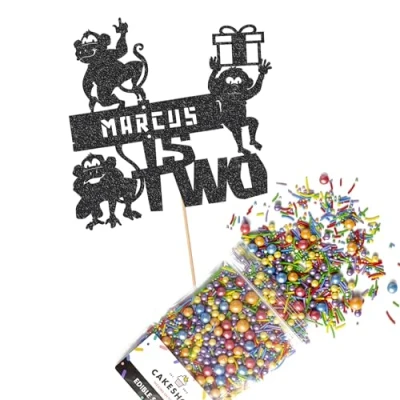 Cakeshop Cake Decoration Pack Cheeky Monkey Birthday Premium Double Sided Glitter Card Topper & 25g Party of Sugar Sprinkles Custom Name Age (Black)