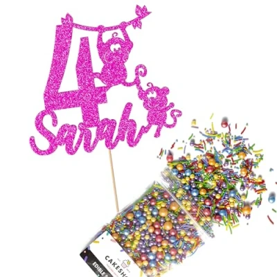 Cakeshop Cake Decoration Pack Cheeky Monkey Birthday Premium Double Sided Glitter Card Topper & 25g Party of Sugar Sprinkles Custom Name Age (Bright Pink)