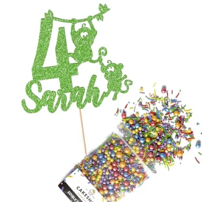 Cakeshop Cake Decoration Pack Cheeky Monkey Birthday Premium Double Sided Glitter Card Topper & 25g Party of Sugar Sprinkles Custom Name Age (Green)