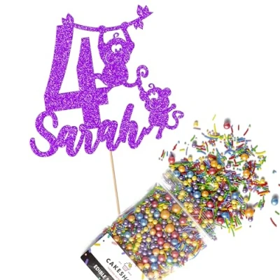 Cakeshop Cake Decoration Pack Cheeky Monkey Birthday Premium Double Sided Glitter Card Topper & 25g Party of Sugar Sprinkles Custom Name Age (Purple)