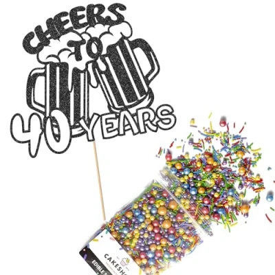 Cakeshop Cake Decoration Pack Cheers Beers Happy Birthday Premium Double Sided Glitter Card Topper & 25g Party of Sugar Sprinkles Custom Age Decorations (Black)