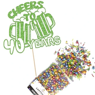 Cakeshop Cake Decoration Pack Cheers Beers Happy Birthday Premium Double Sided Glitter Card Topper & 25g Party of Sugar Sprinkles Custom Age Decorations (Green)