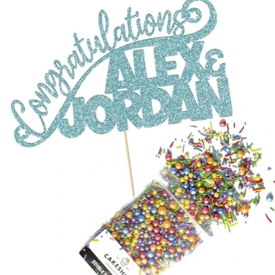 Cakeshop Cake Decoration Pack Congratulations Wedding Premium Double Sided Glitter Card Topper & 25g Party of Sprinkles for your Celebration Custom Name (Baby Blue)