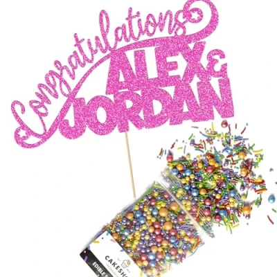 Cakeshop Cake Decoration Pack Congratulations Wedding Premium Double Sided Glitter Card Topper & 25g Party of Sprinkles for your Celebration Custom Name (Baby Pink)