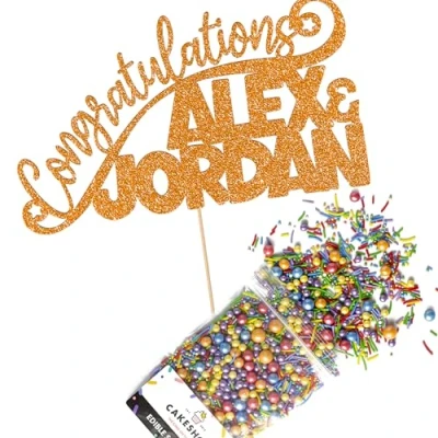 Cakeshop Cake Decoration Pack Congratulations Wedding Premium Double Sided Glitter Card Topper & 25g Party of Sprinkles for your Celebration Custom Name (Orange)