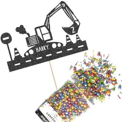 Cakeshop Cake Decoration Pack Construction Digger Premium Double Sided Glitter Card Topper & 25g Party of Sugar Sprinkles Custom Name Age Decorations (Black)