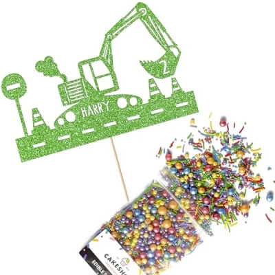 Cakeshop Cake Decoration Pack Construction Digger Premium Double Sided Glitter Card Topper & 25g Party of Sugar Sprinkles Custom Name Age Decorations (Green)
