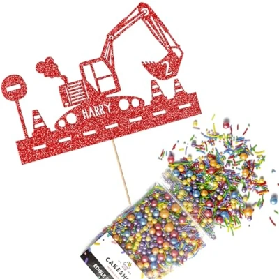 Cakeshop Cake Decoration Pack Construction Digger Premium Double Sided Glitter Card Topper & 25g Party of Sugar Sprinkles Custom Name Age Decorations (Red)