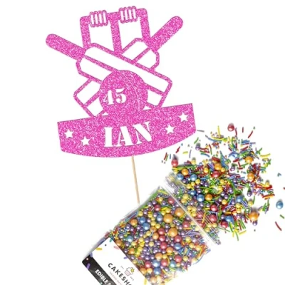 Cakeshop Cake Decoration Pack Cricket Birthday Theme Premium Double Sided Glitter Card Topper & 25g Party of Sugar Sprinkles Custom Name Age Decorations (Baby Pink)