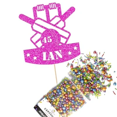 Cakeshop Cake Decoration Pack Cricket Birthday Theme Premium Double Sided Glitter Card Topper & 25g Party of Sugar Sprinkles Custom Name Age Decorations (Bright Pink)