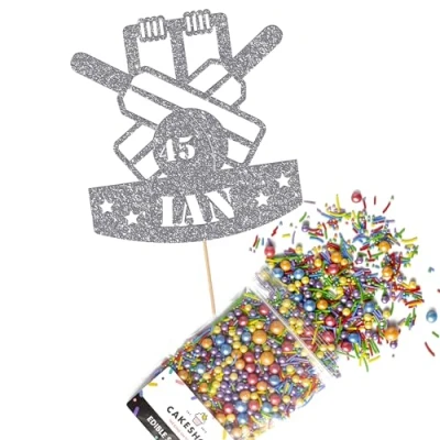 Cakeshop Cake Decoration Pack Cricket Birthday Theme Premium Double Sided Glitter Card Topper & 25g Party of Sugar Sprinkles Custom Name Age Decorations (Dark Silver)