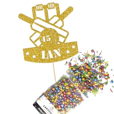 Cakeshop Cake Decoration Pack Cricket Birthday Theme Premium Double Sided Glitter Card Topper & 25g Party of Sugar Sprinkles Custom Name Age Decorations (Gold)