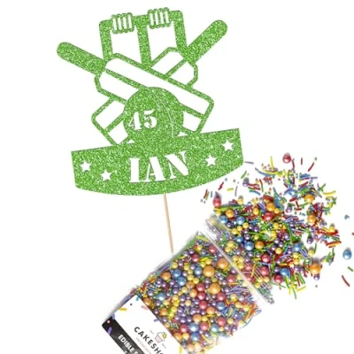 Cakeshop Cake Decoration Pack Cricket Birthday Theme Premium Double Sided Glitter Card Topper & 25g Party of Sugar Sprinkles Custom Name Age Decorations (Green)