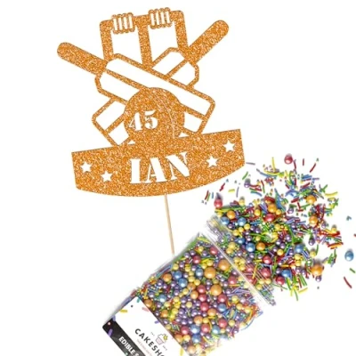 Cakeshop Cake Decoration Pack Cricket Birthday Theme Premium Double Sided Glitter Card Topper & 25g Party of Sugar Sprinkles Custom Name Age Decorations (Orange)