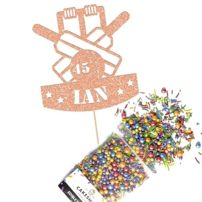 Cakeshop Cake Decoration Pack Cricket Birthday Theme Premium Double Sided Glitter Card Topper & 25g Party of Sugar Sprinkles Custom Name Age Decorations (Rose Gold)