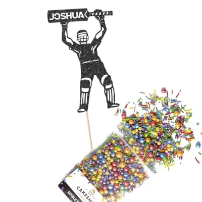 Cakeshop Cake Decoration Pack Cricket Birthday Theme Premium Double Sided Glitter Card Topper Sign & 25g Party of Sugar Sprinkles Custom Name Decorations (Black)