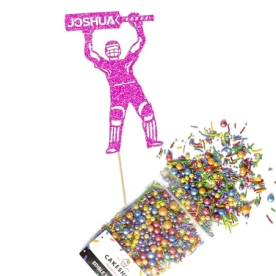 Cakeshop Cake Decoration Pack Cricket Birthday Theme Premium Double Sided Glitter Card Topper Sign & 25g Party of Sugar Sprinkles Custom Name Decorations (Bright Pink)