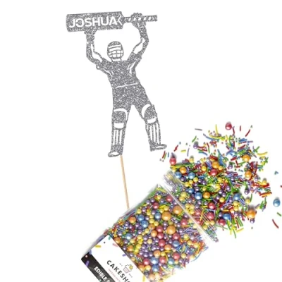Cakeshop Cake Decoration Pack Cricket Birthday Theme Premium Double Sided Glitter Card Topper Sign & 25g Party of Sugar Sprinkles Custom Name Decorations (Dark Silver)