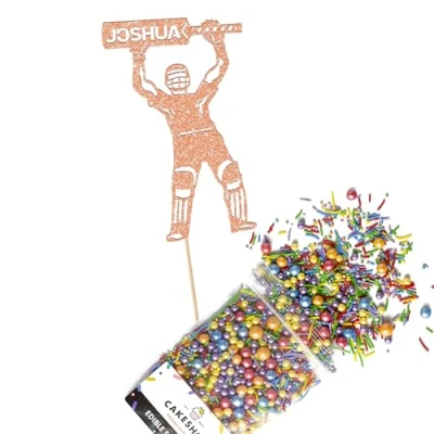 Cakeshop Cake Decoration Pack Cricket Birthday Theme Premium Double Sided Glitter Card Topper Sign & 25g Party of Sugar Sprinkles Custom Name Decorations (Rose Gold)