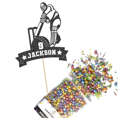 Cakeshop Cake Decoration Pack Cricket Theme Premium Double Sided Glitter Card Topper Sign & 25g Party of Sugar Sprinkles Custom Name Age Decorations (Black)