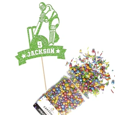 Cakeshop Cake Decoration Pack Cricket Theme Premium Double Sided Glitter Card Topper Sign & 25g Party of Sugar Sprinkles Custom Name Age Decorations (Green)