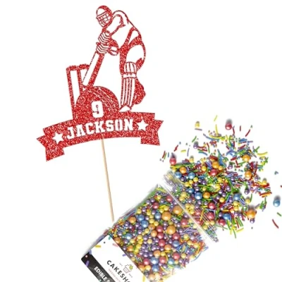 Cakeshop Cake Decoration Pack Cricket Theme Premium Double Sided Glitter Card Topper Sign & 25g Party of Sugar Sprinkles Custom Name Age Decorations (Red)