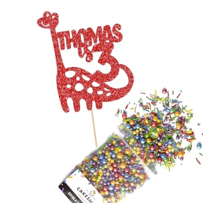 Cakeshop Cake Decoration Pack Cute Birthday Dinosaur Premium Double Sided Glitter Card Topper & 25g Party of Sugar Sprinkles Custom Name Age (Red)