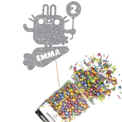 Cakeshop Cake Decoration Pack Cute Bunny Rabbit Premium Double Sided Glitter Card Topper Sign & 25g Party of Sugar Sprinkles Custom Name Age Decorations (Dark Silver)