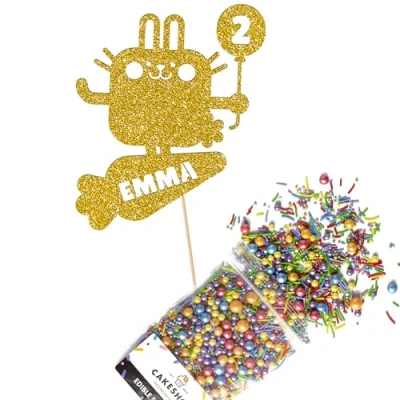 Cakeshop Cake Decoration Pack Cute Bunny Rabbit Premium Double Sided Glitter Card Topper Sign & 25g Party of Sugar Sprinkles Custom Name Age Decorations (Gold)