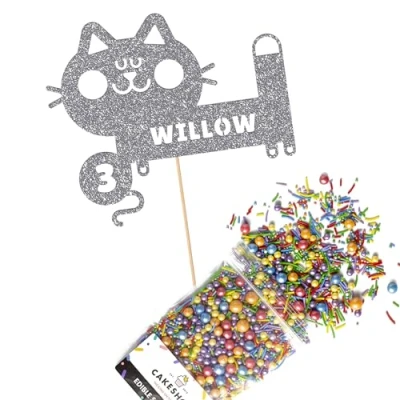 Cakeshop Cake Decoration Pack Cute Cat Birthday Premium Double Sided Glitter Card Topper Sign & 25g Party of Sugar Sprinkles Custom Name Age Decorations (Dark Silver)