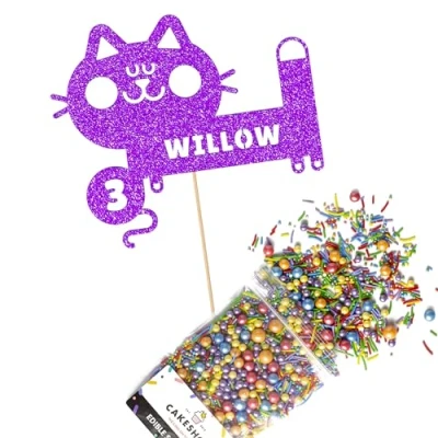 Cakeshop Cake Decoration Pack Cute Cat Birthday Premium Double Sided Glitter Card Topper Sign & 25g Party of Sugar Sprinkles Custom Name Age Decorations (Purple)